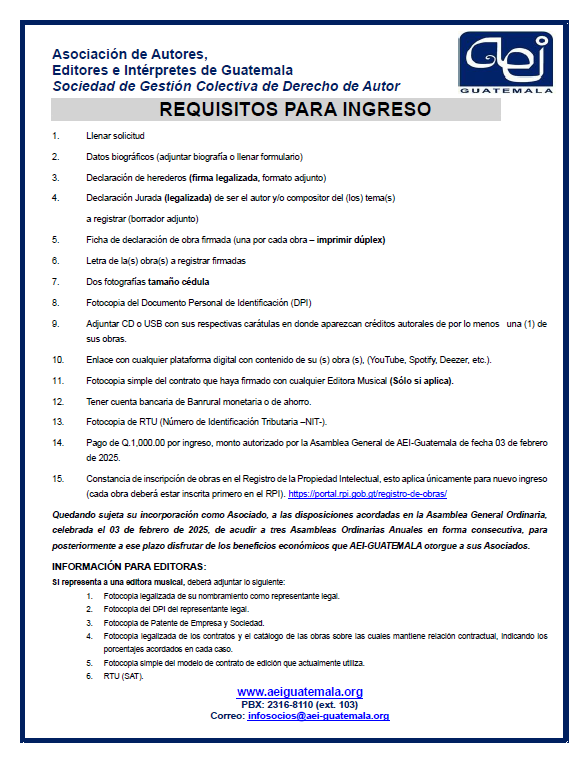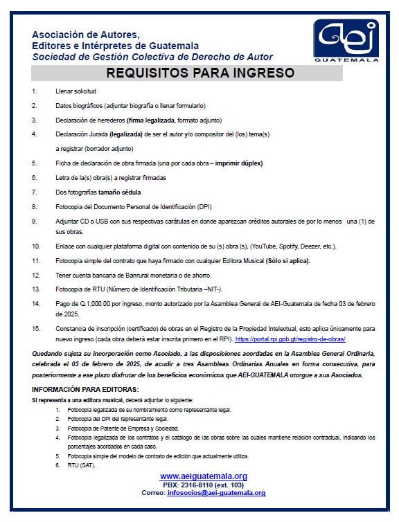 - Pago de Q.1,000.00 por ingreso, monto autorizado por la Asamblea General de AEI-Guatemala de fecha 03 de febrero de 2025.